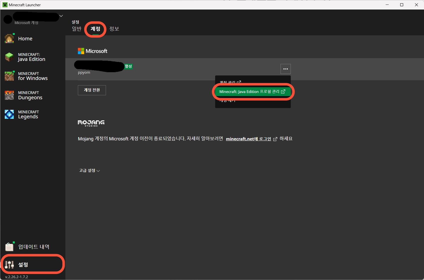 ๋ง์ธํฌ๋ํํธ ๋ฐ์ฒ ์คํ - ์ค์ - ๊ณ์ ํญ์ผ๋ก ์ด๋ ํ Minecraft: Java Edition ํ๋กํ ๊ด๋ฆฌ ํ์ด์ง๋ก ์ด๋ํฉ๋๋ค.